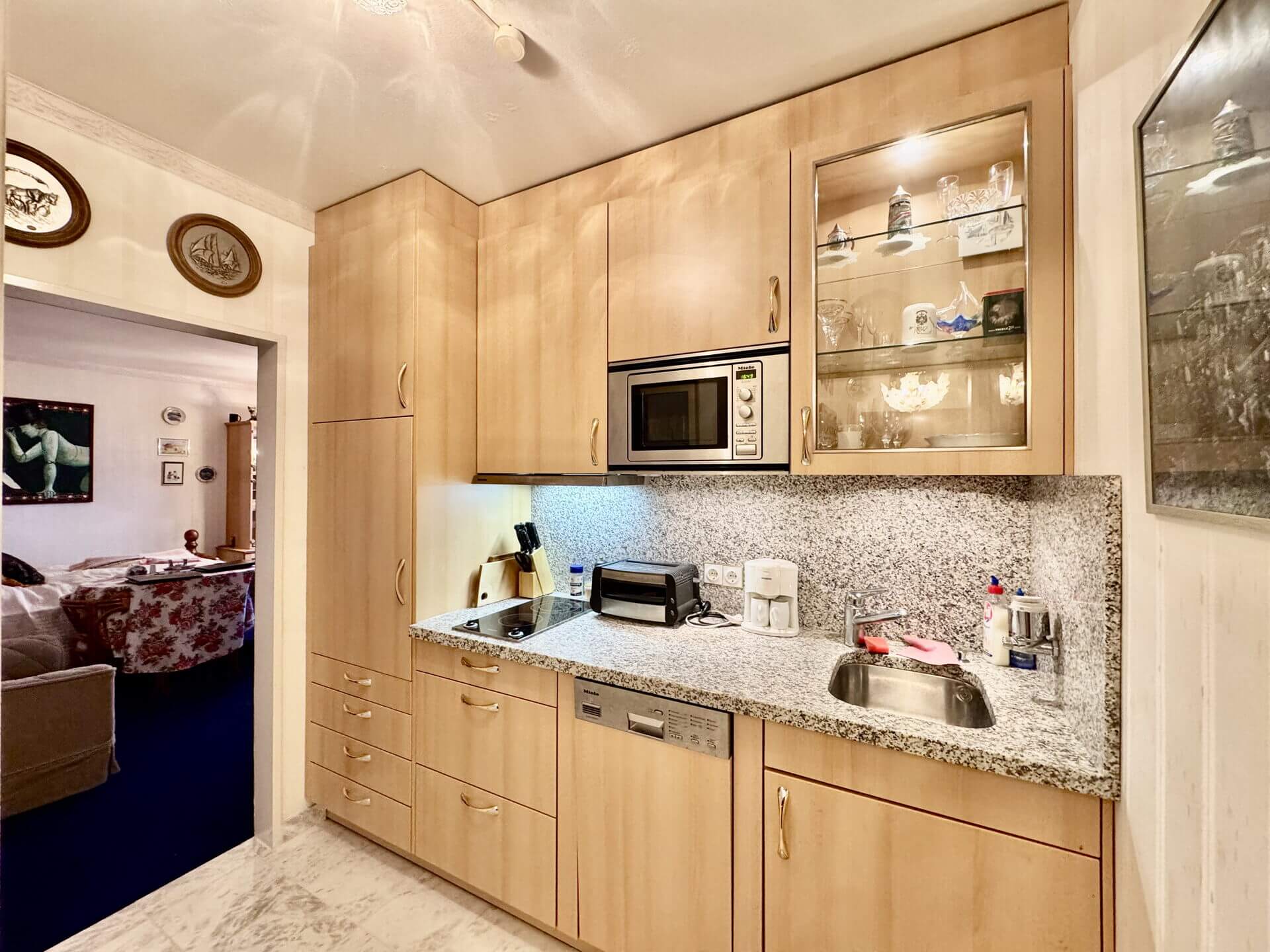 Darüber hinaus verfügt die Wohnung über eine hochwertige Pantryküche sowie ein stilvolles Badezimmer, das mit edlem Carrara-Marmor ausgestattet ist. Ein Tiefgaragenstellplatz, der sich unmittelbar am Fahrstuhl befindet und einen komfortablen Zugang zur Wohnung ermöglicht, rundet dieses attraktive Angebot ab.