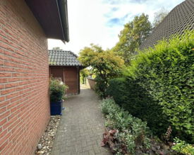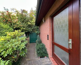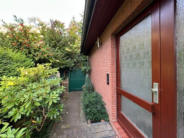 Seitlich des Hauses gelangen Sie zur Eingangstür des Hauses und erreichen durch einen kleinen Flur die Wohnungstür. Auf der rechten Hausseite befinden sich die Küche mit Einbauküche, das Schlafzimmer sowie das Badezimmer mit Dusche und Wanne.