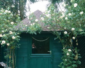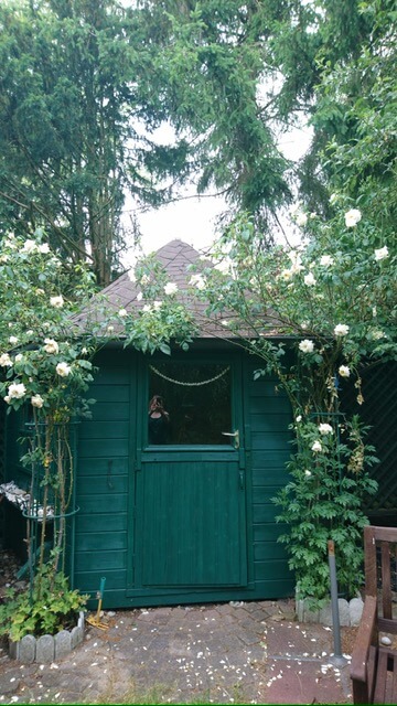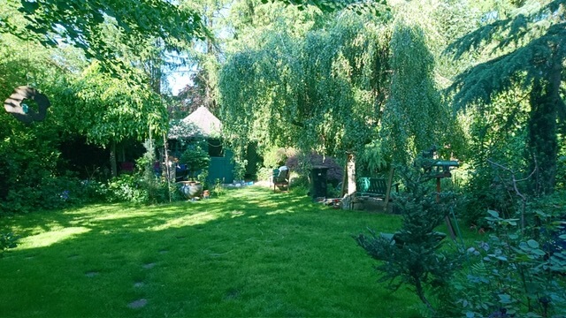 Der Gartenanteil ist schön eingewachsen und verfügt -außer der Terrasse- noch über zwei Gartenhäuser, davon eines 2024 renoviert und zwei kleineren Abstellhütten.