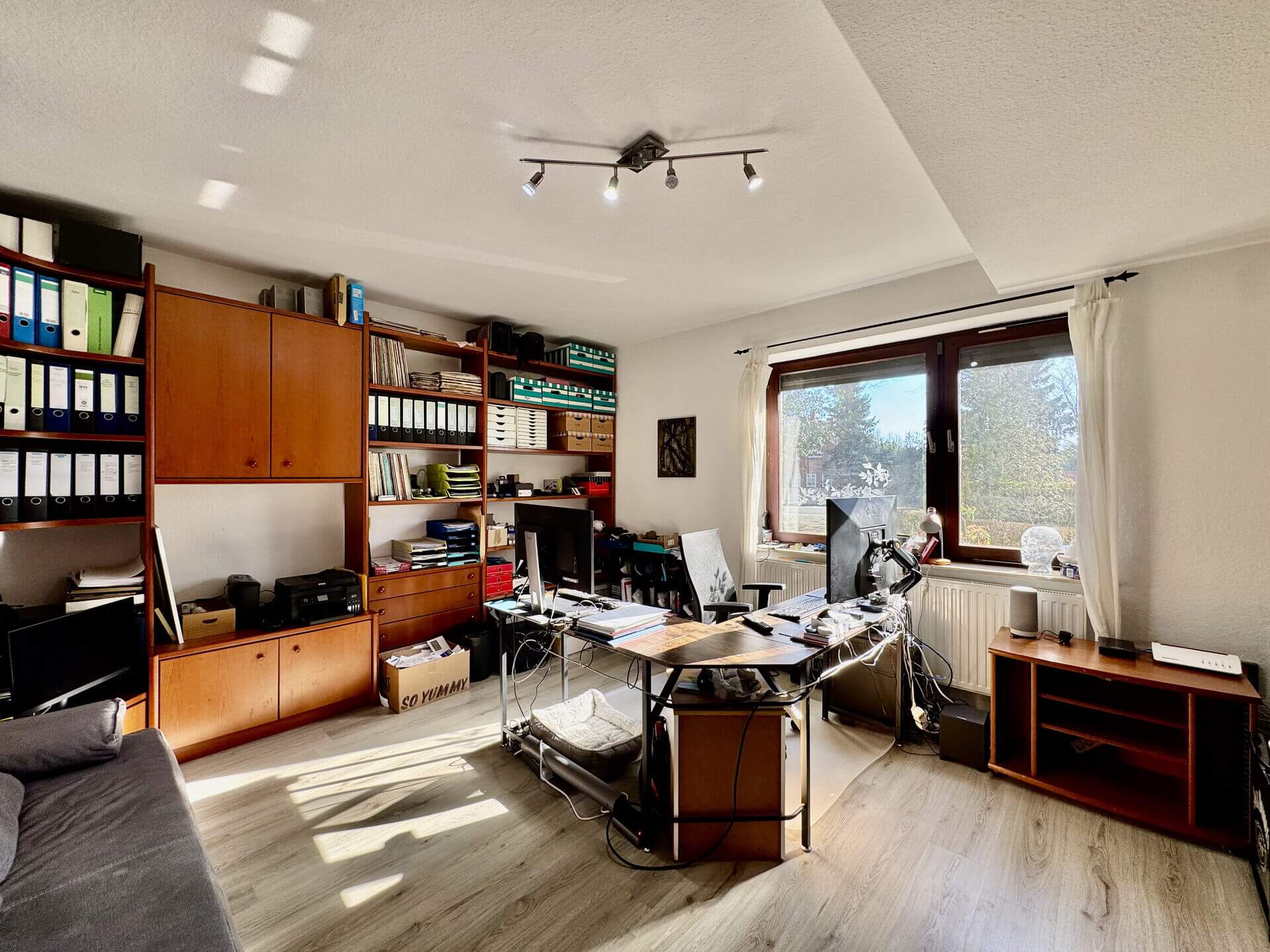 Rechts des Eingangsbereiches liegt das etwa 30 Quadratmeter große Wohnzimmer, das ebenfalls einen direkten Zugang zur Terrasse und zum Garten bietet. Neben dem Wohnzimmer befindet sich ein weiterer Raum, der aktuell als Büro genutzt wird. Das Hauptbad ist mit Dusche und Badewanne ausgestattet und verfügt ebenfalls über ein Außenfenster.