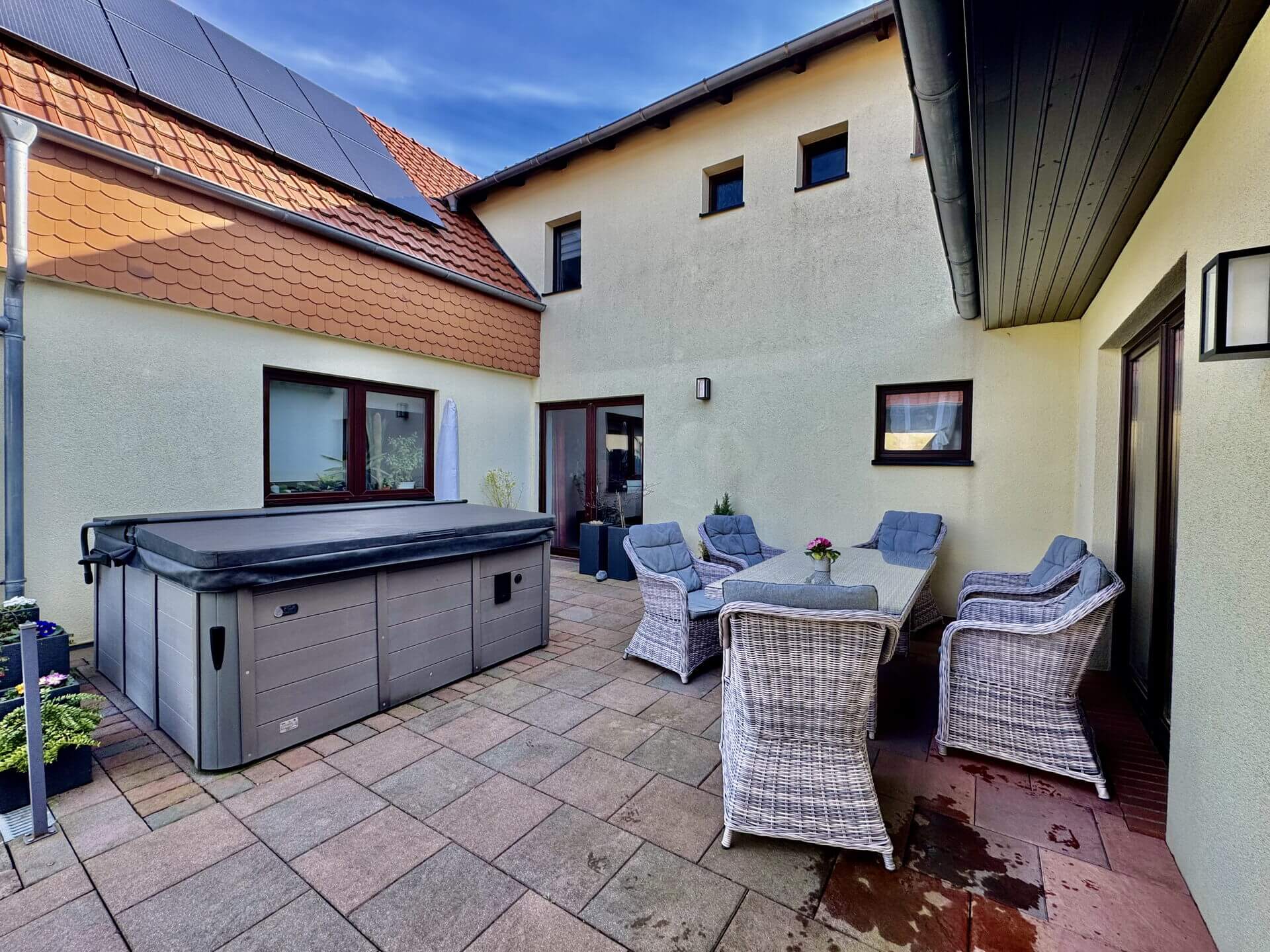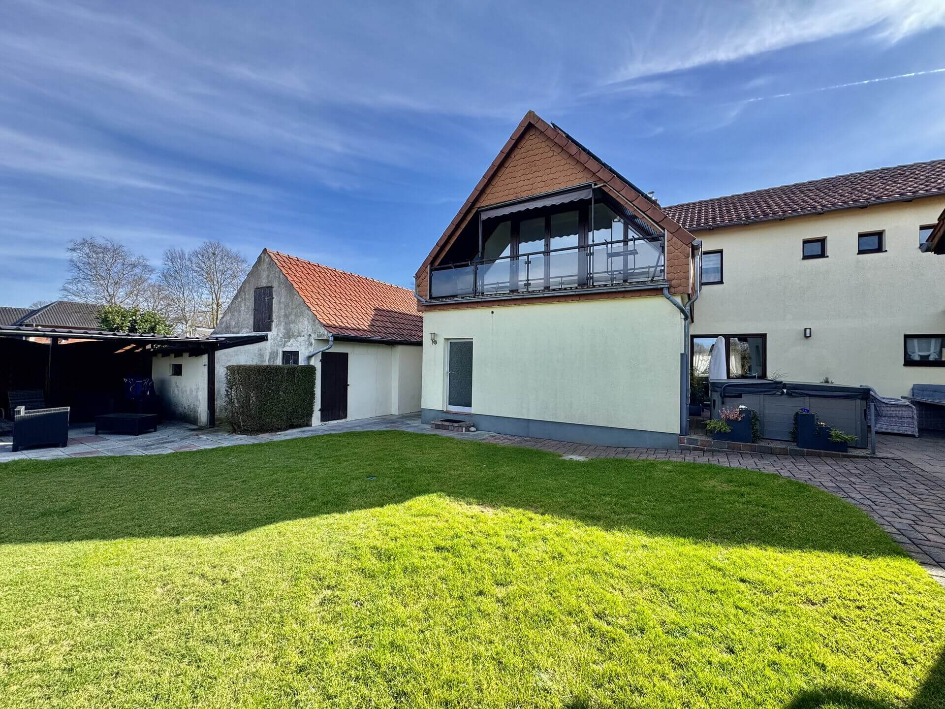 Das weitläufige Grundstück lädt zum Entspannen und Verweilen ein. Neben der Terrasse erwarten Sie mehrere gemütliche Sitzmöglichkeiten, eine Streuobstwiese sowie ein traumhafter Blick über die umliegenden Wiesen und Felder, der diesem besonderen Anwesen eine außergewöhnlich ruhige und naturnahe Atmosphäre verleiht.