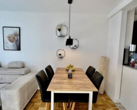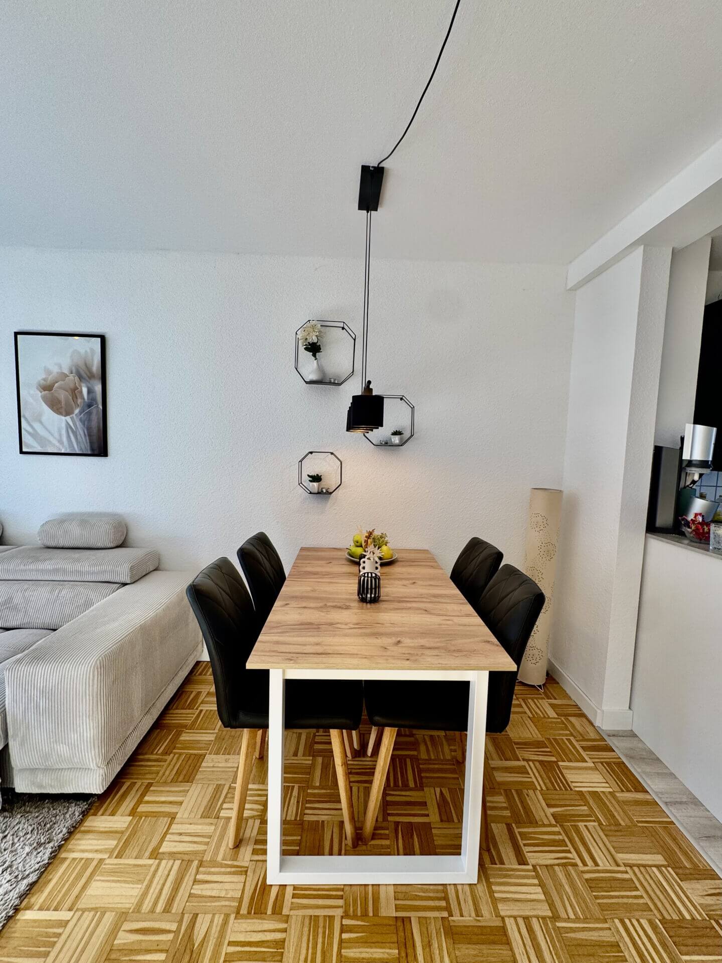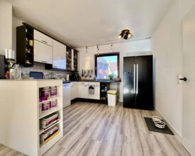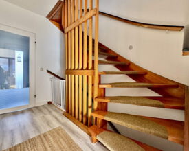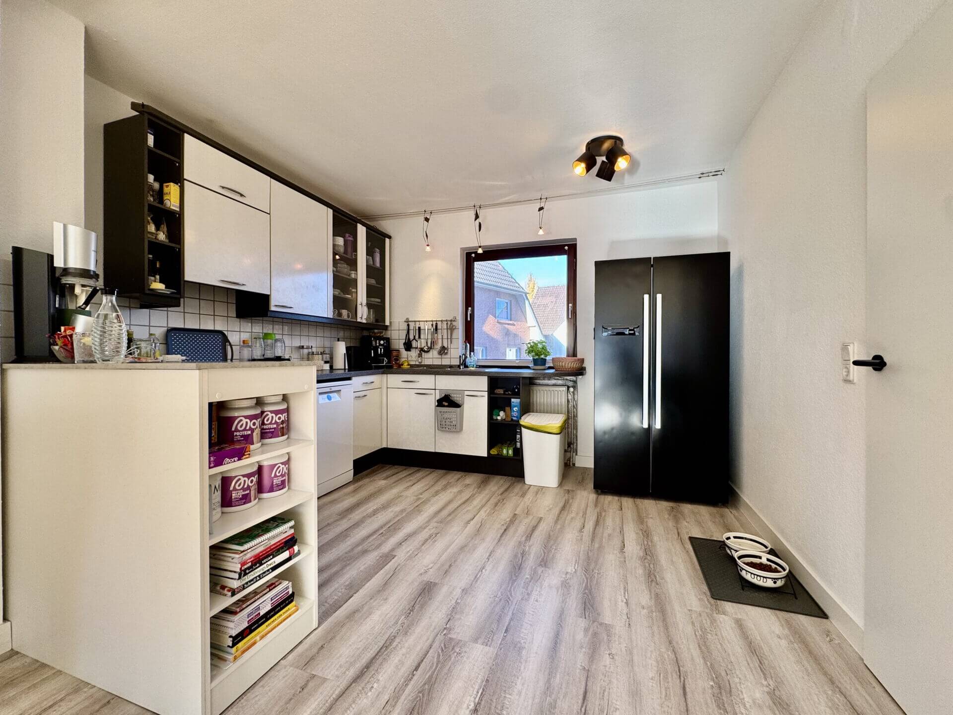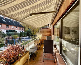 Durch die Hauseingangstür gelangen Sie in den Vorflur des Hauses. Auf der linken Seite befindet sich ein Gäste-WC mit Fenster. Eine weitere Tür führt in den Flur mit der Treppe. Der großzügige und helle Wohn- und Essbereich mit offener Küche ist zur Gartenseite ausgerichtet. Ein Balkon, der sich über die gesamte Hausbreite erstreckt, lädt zu stimmungsvollen Sommerabenden ein. Eine große Markise bietet die Möglichkeit zur Beschattung. Die Küche verfügt über eine Einbauküche, die mit allen üblichen Elektrogeräten ausgestattet ist.